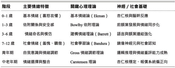 若以生命歷程的時間軸來看,我們可以將情緒發展簡化為以下階段: